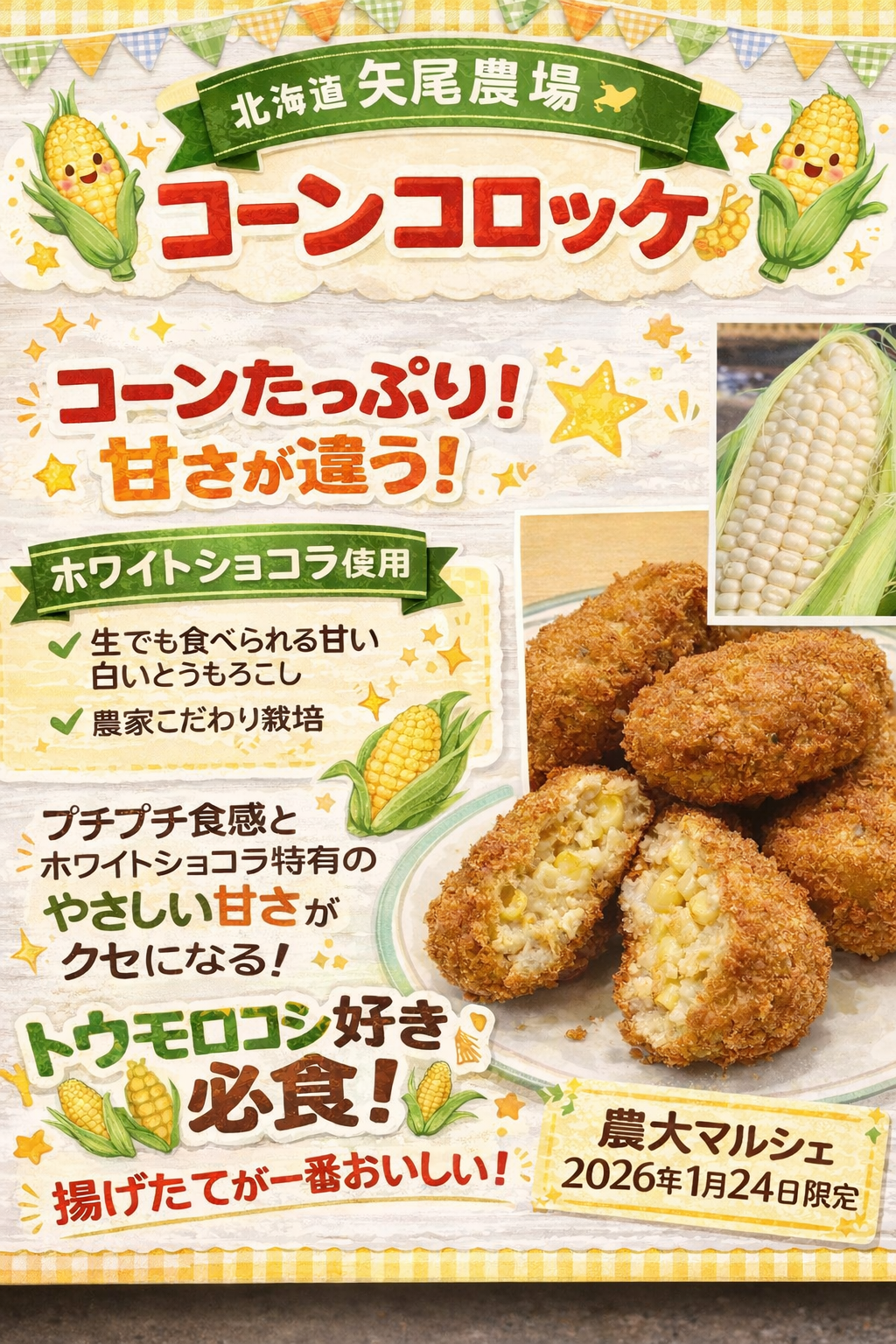 農大マルシェを通じて広がったご縁を大切にしながら、「美味しくて、身体に嬉しい」食をお届けしたい。そんな想いが詰まったコーンコロッケを、ぜひこの機会にお楽しみください。